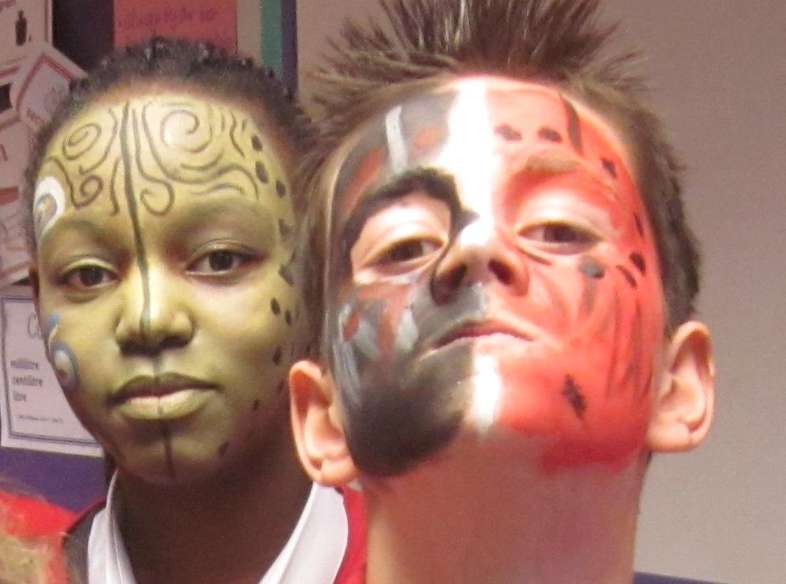 Years 5 and 6 had a fantastic time recently when they transformed each other into Ancient Mayan warriors as part of a cross curricular approach to art/history. After looking at images to find out themes in Ancient Mayan body decoration the children painted each other’s faces until some were almost unrecognisable! Many brave warriors left school at the end of the day fully made up. Did you see them?